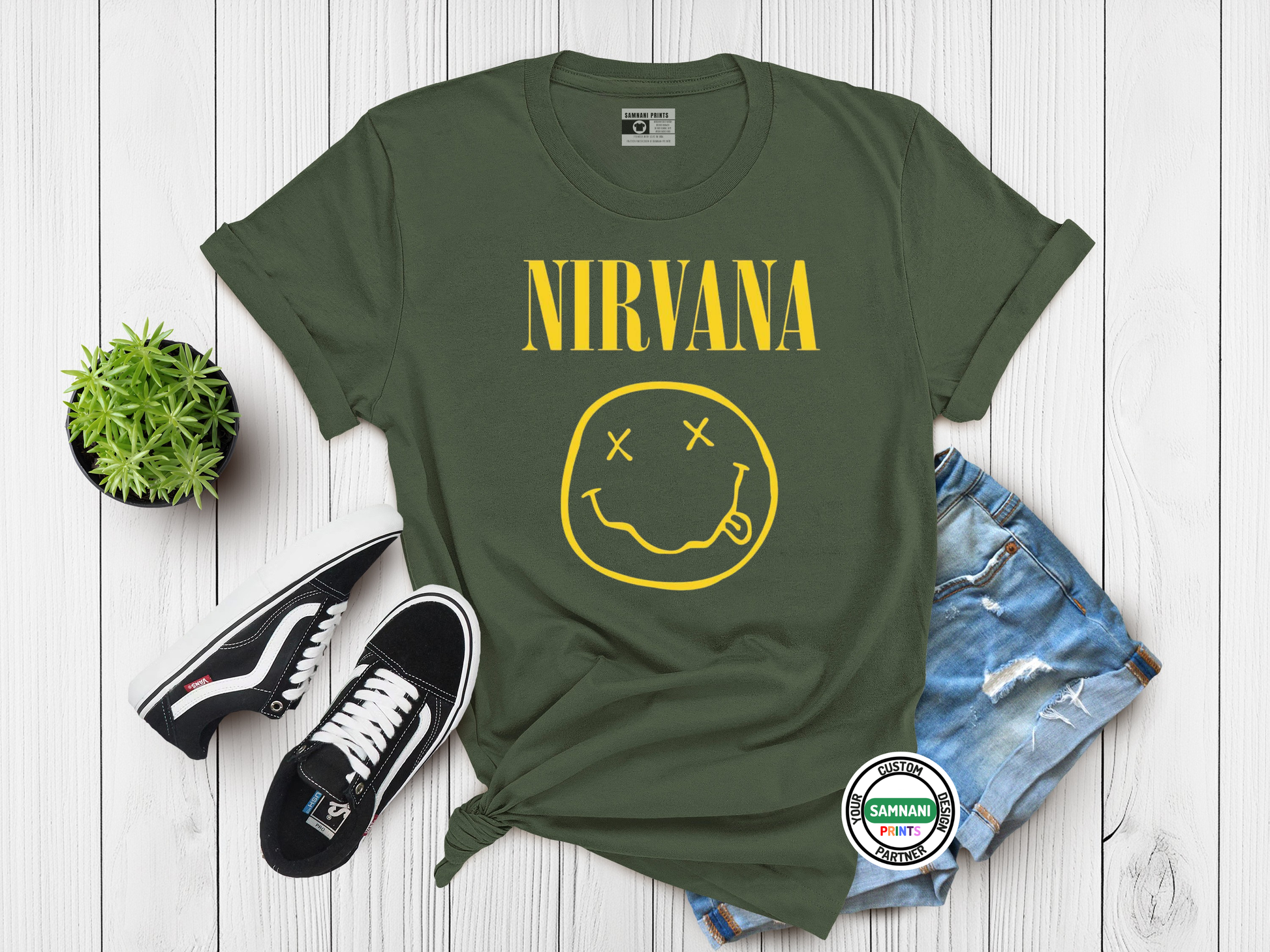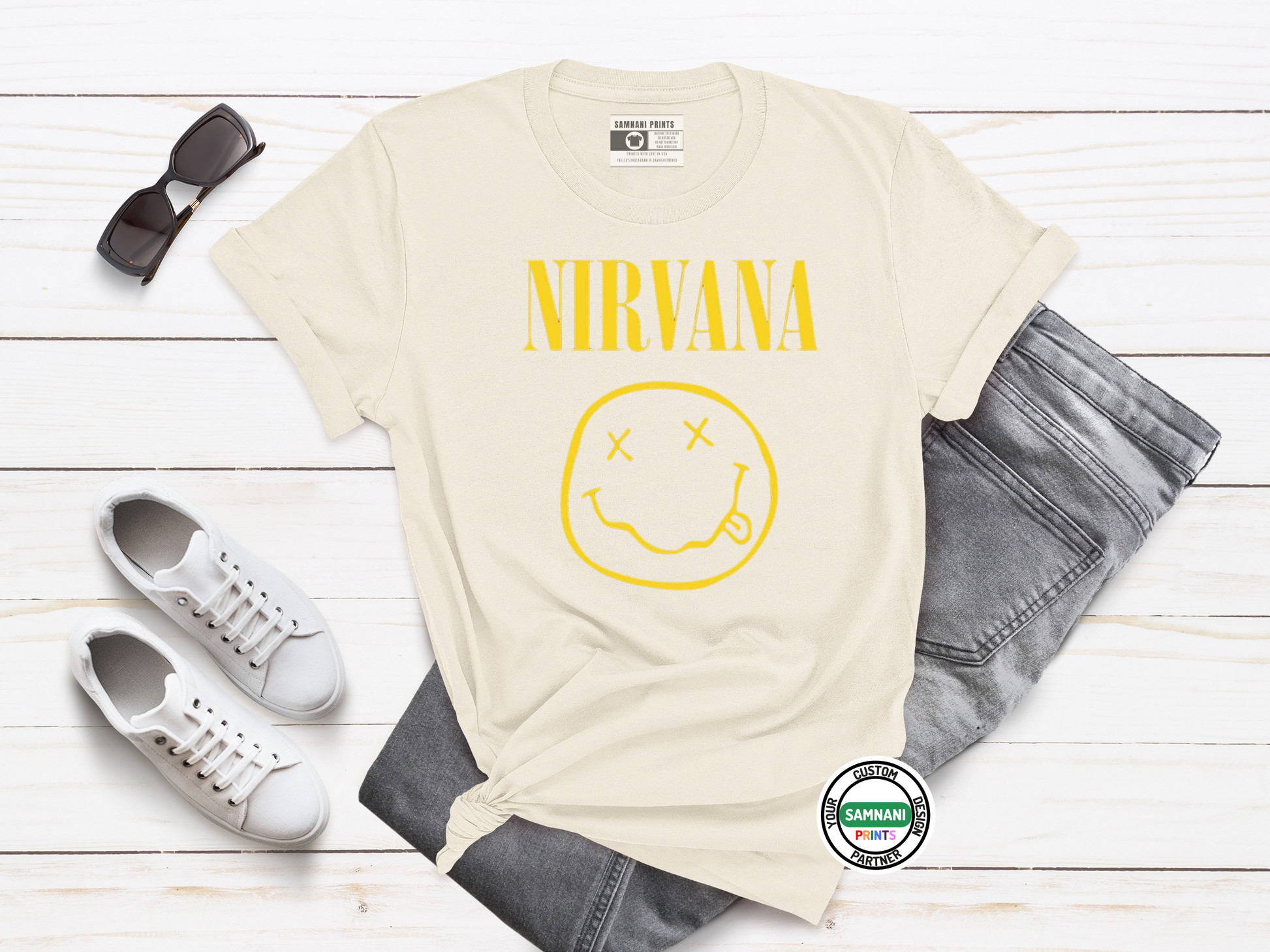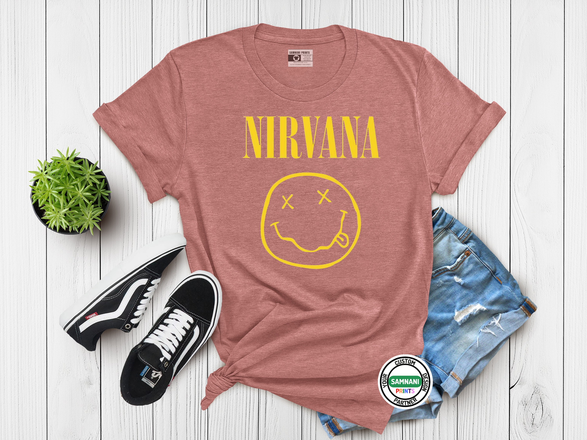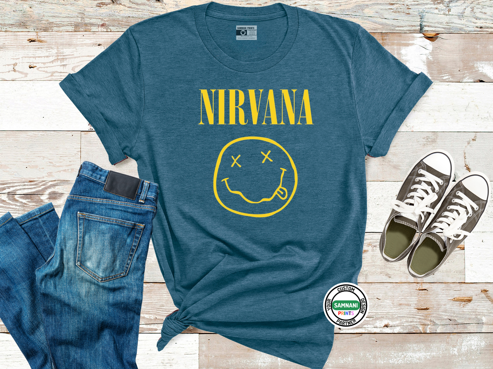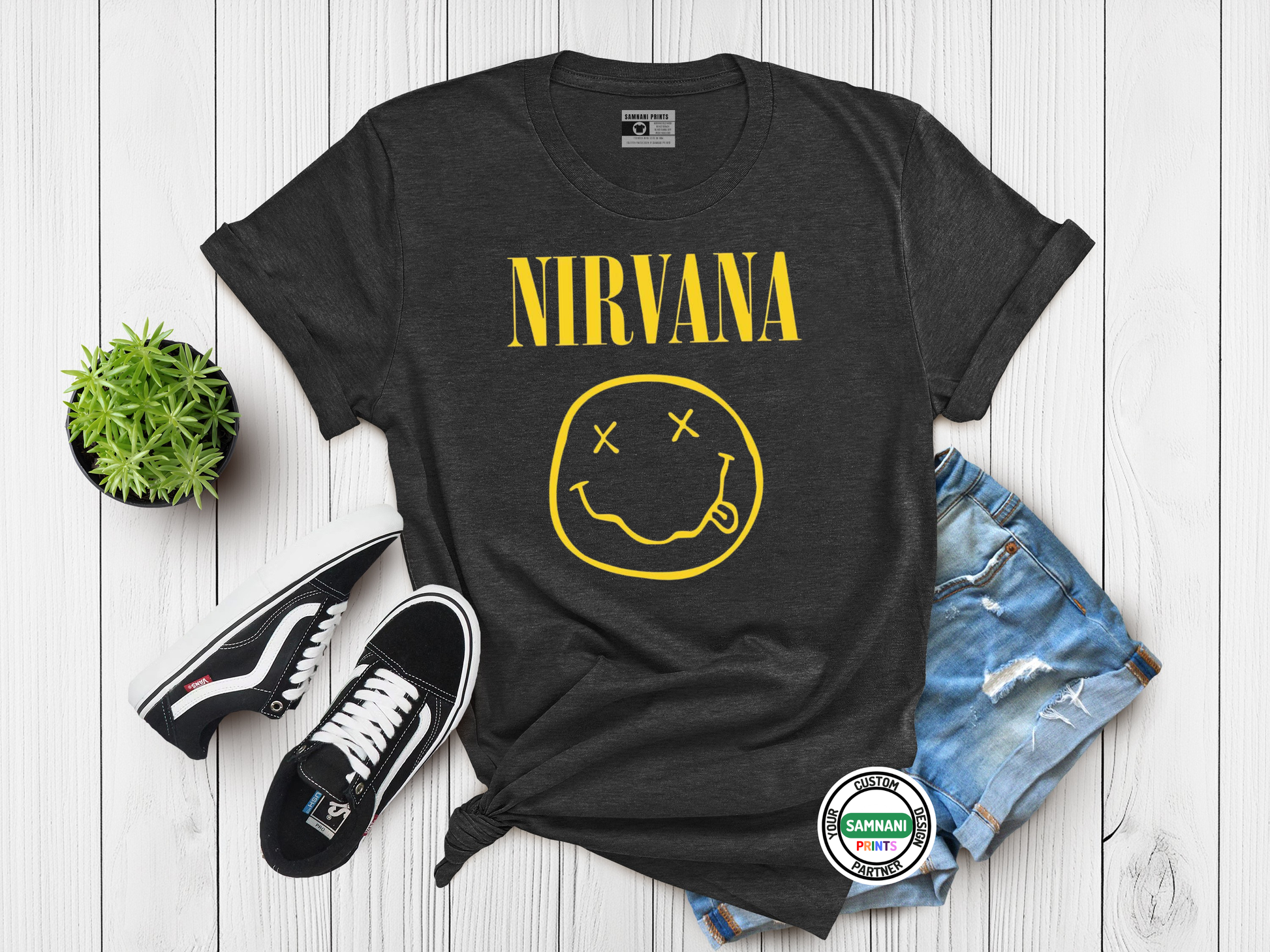 Relive the golden age of grunge with this classic Nirvana band t-shirt! Featuring the iconic smiley face logo and bold "NIRVANA" text, this vintage-inspired graphic tee is perfect for fans of 90s music, alternative rock, and grunge fashion. Whether you're heading to a concert, chilling at home, or styling a streetwear look, this shirt delivers both comfort and timeless edge.